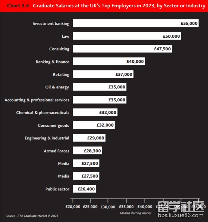 預(yù)計(jì)2023年畢業(yè)生起薪最高的是投資銀行領(lǐng)域,起薪中位數(shù)為55,000英鎊,其次是律所,起薪中位數(shù)為50,000英鎊和咨詢公司,起薪中位數(shù)為47,500英鎊。
