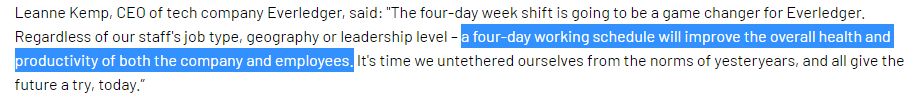 英國EVERLEDGER公司也參與了制度改革試驗(yàn),CEO大力稱贊四天工作制對提升員工的健康和效率有極大的幫助。