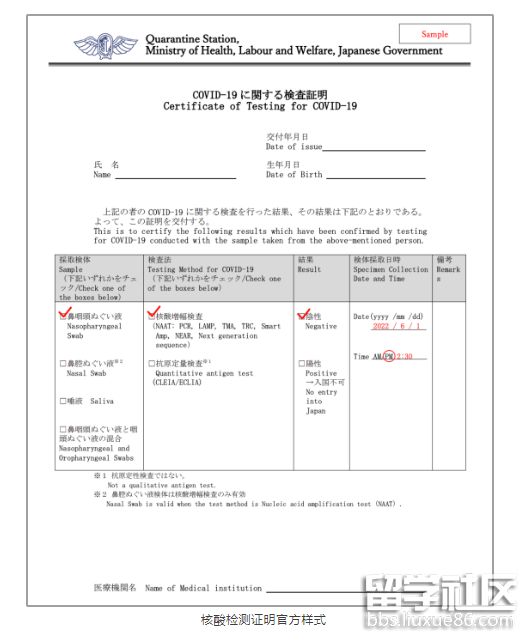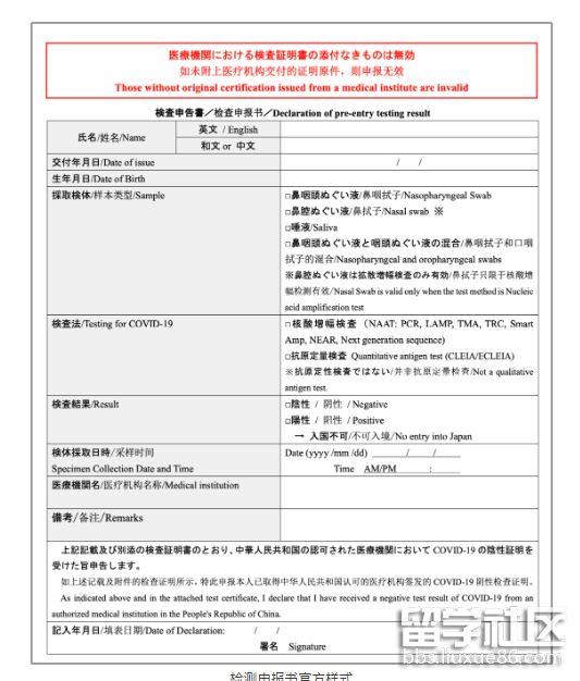 第二種 : 非指定樣式的中英文版核酸檢測報(bào)告+檢測申報(bào)書(需在大使館官網(wǎng)下載并填寫)。