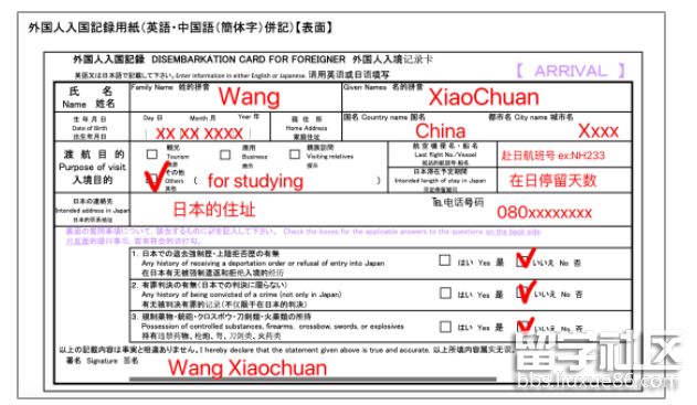 1. 外國人入境記錄卡 — 需要填寫日本的住址、聯(lián)系電話以及個(gè)人基礎(chǔ)信息?! ?BR> 外國人入境記錄卡樣本