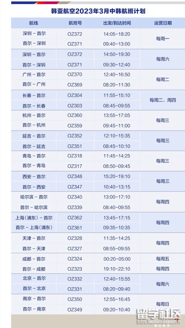 2023年3月,韓亞航空共運(yùn)營15班中韓直飛航班。