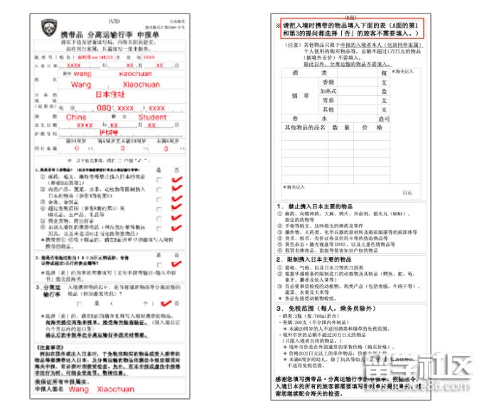 2. 海關(guān)申報(bào)單 — 關(guān)于攜帶物品相關(guān)的申報(bào),會(huì)要求填寫個(gè)人信息以及是否攜帶違禁物品等。注意不能將任何肉制品,水果或蔬菜帶入日本。
