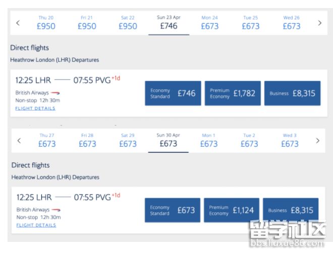 目前從英國航空官網(wǎng)查詢到的售票信息,經(jīng)濟(jì)艙4月23日復(fù)航當(dāng)天的機(jī)票為£746,其余時間票價基本為£673起。