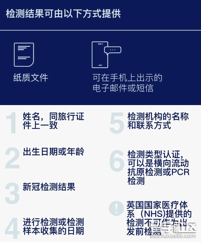 需要注意的是,在4月5日前,入境英國,仍需要提供48小時內(nèi)核酸檢測陰性證明。報告必須包括以下信息: