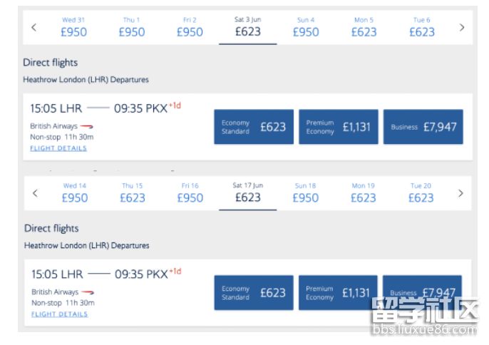 目前從英國航空官網(wǎng)查詢到的售票信息,經(jīng)濟(jì)艙票價基本在£623起。