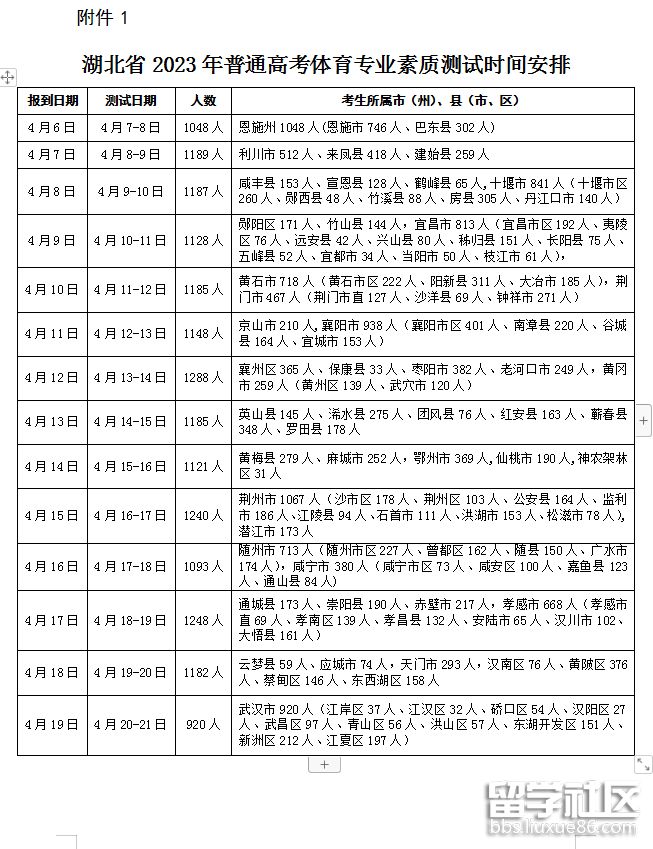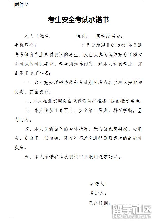 完成我省2023年普通高考網(wǎng)上報名、現(xiàn)場確認,且網(wǎng)上繳費成功的體育類考生可參加普通高考體育專業(yè)素質(zhì)測試(以下簡稱體育測試)。我省體育測試考點設(shè)置在湖北大學(xué)。考生報到時間為2023年4月6日至19日,測試時間為2023年4月7日至21日。參加體育測試的考生須按照湖北省2023年體育專業(yè)素質(zhì)測試時間安排(見附件1),在報到日持本人普通高考報名登記表、身份證原件、《考生安全考試承諾書》(見附件2),到湖北大學(xué)考點辦理體育測試報到手續(xù),核驗考生虹膜信息,領(lǐng)取測試準考證和測試服裝,繳納相關(guān)費用。