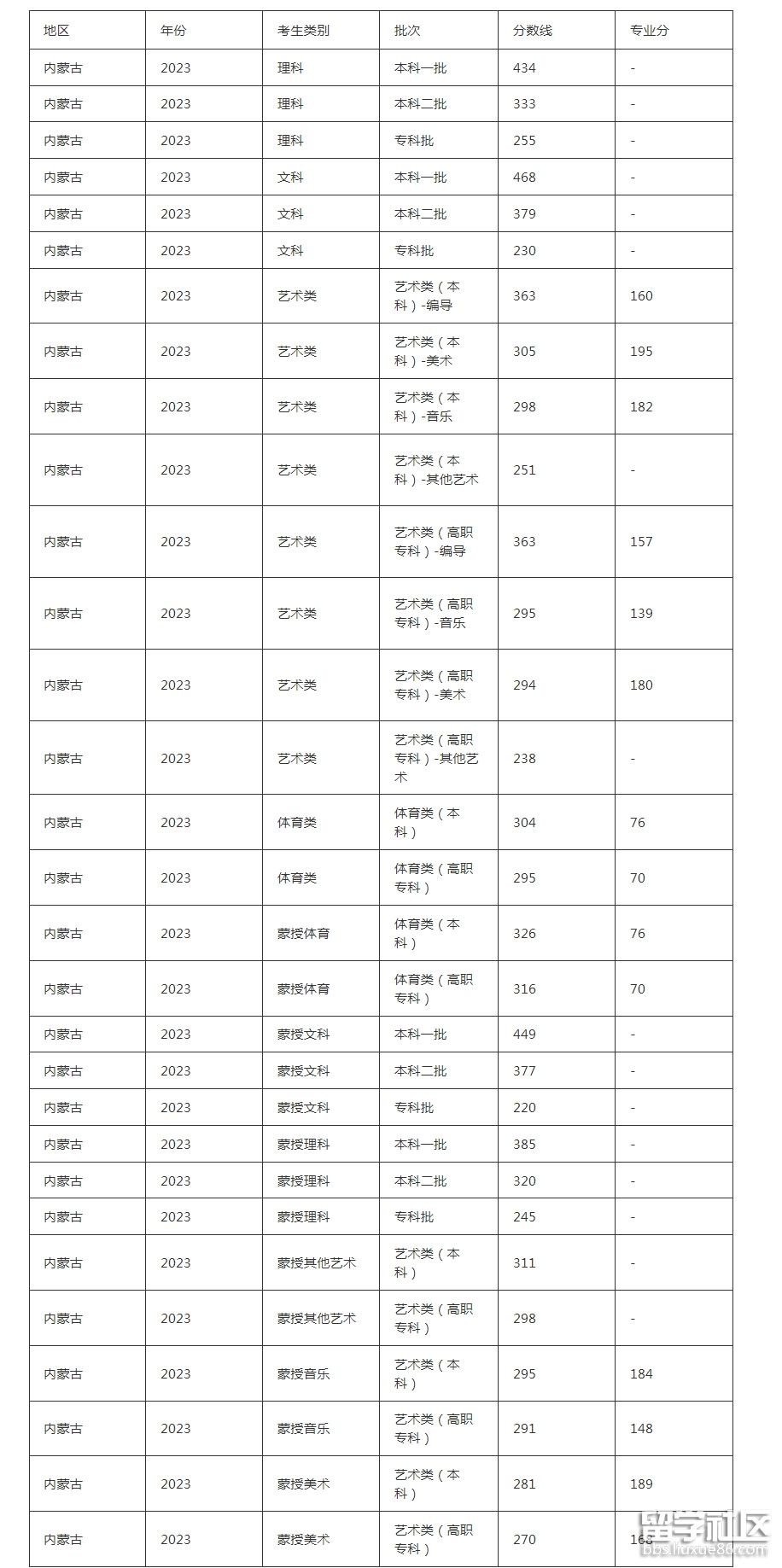 二、2023年內(nèi)蒙古高考錄取分?jǐn)?shù)線一覽表