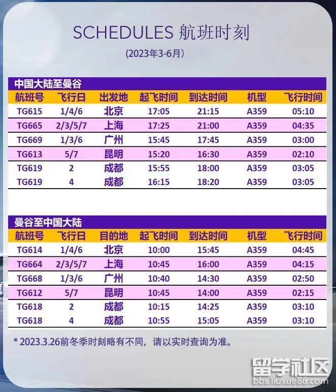 泰國(guó)航空公布3-6月中泰往返航班計(jì)劃如下:
