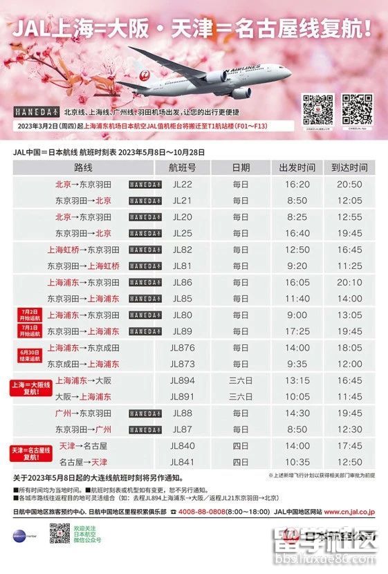日本航空J(rèn)AL春季、夏季航班信息已公布,大批中日航班即將復(fù)航或加密。日本航空J(rèn)AL春季時(shí)刻表(3月26日-5月7日)如下: