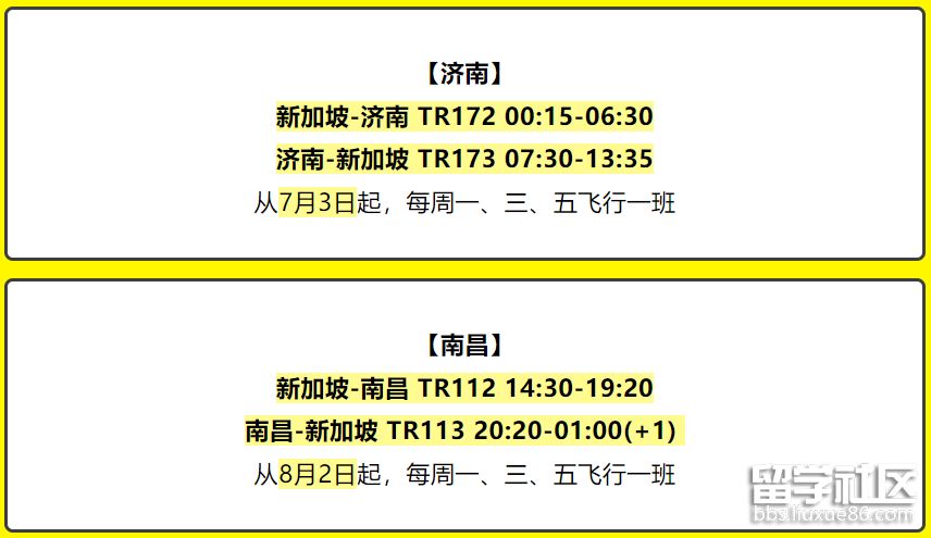新加坡往返濟(jì)南、南昌航線(xiàn)將分別于7月、8月復(fù)航,航班時(shí)刻表如下:
