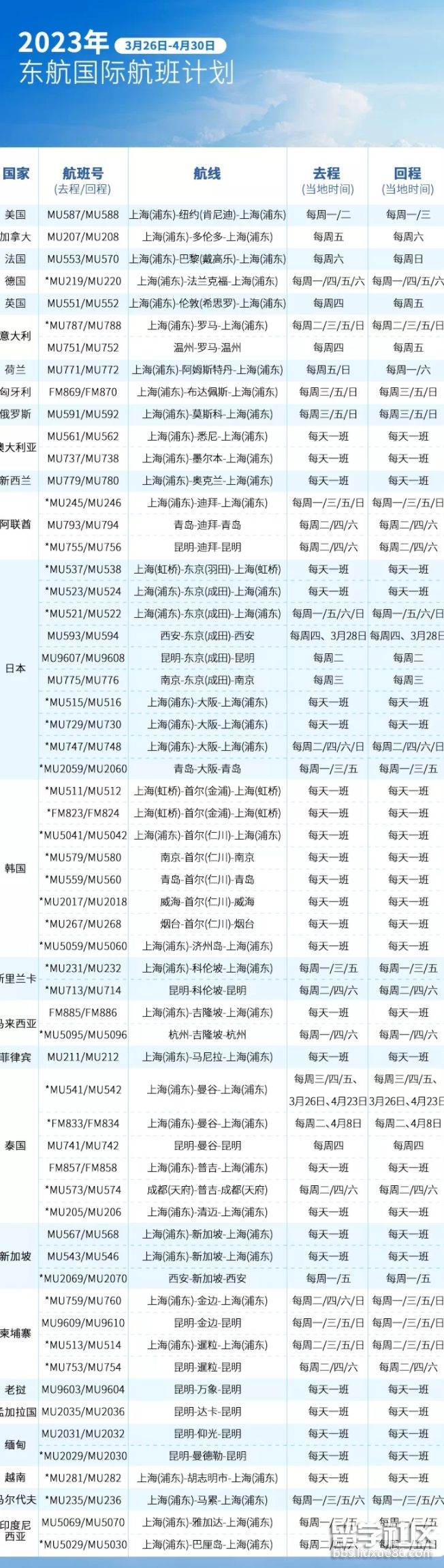 即日起至2023年9月26日(不適用日期:2023年4月26日至5月1日),上海出發(fā)航班信息公布如下: