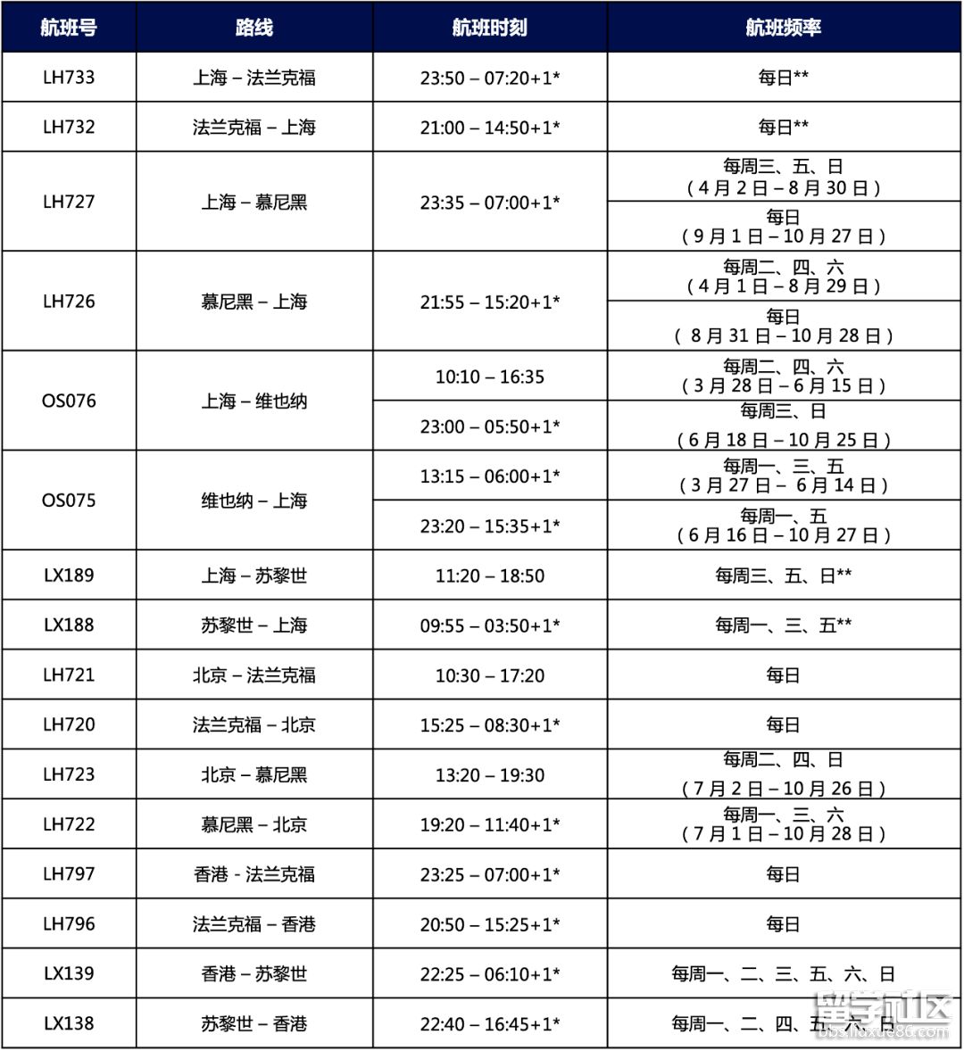 漢莎航空集團(tuán)大中華區(qū)夏季航班時(shí)刻表