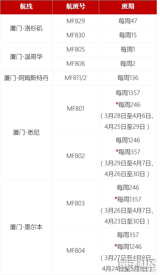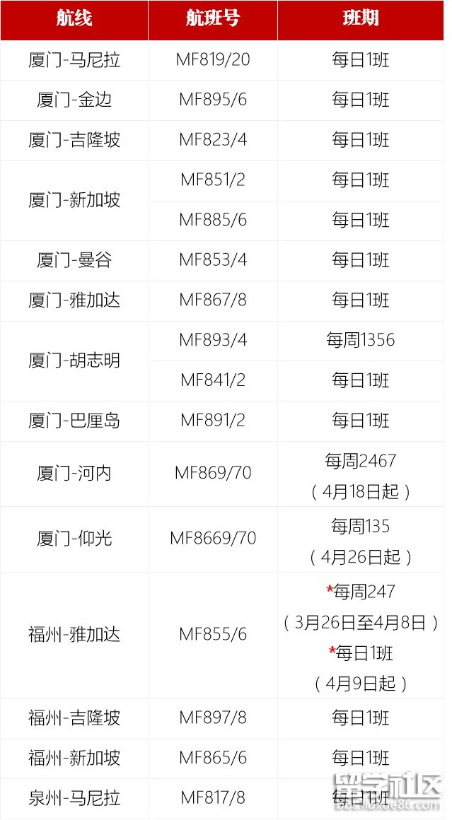 新航季,廈航恢復(fù)、增飛多條國(guó)際及地區(qū)航線(xiàn),廈航4月國(guó)際及地區(qū)航班計(jì)劃如下: