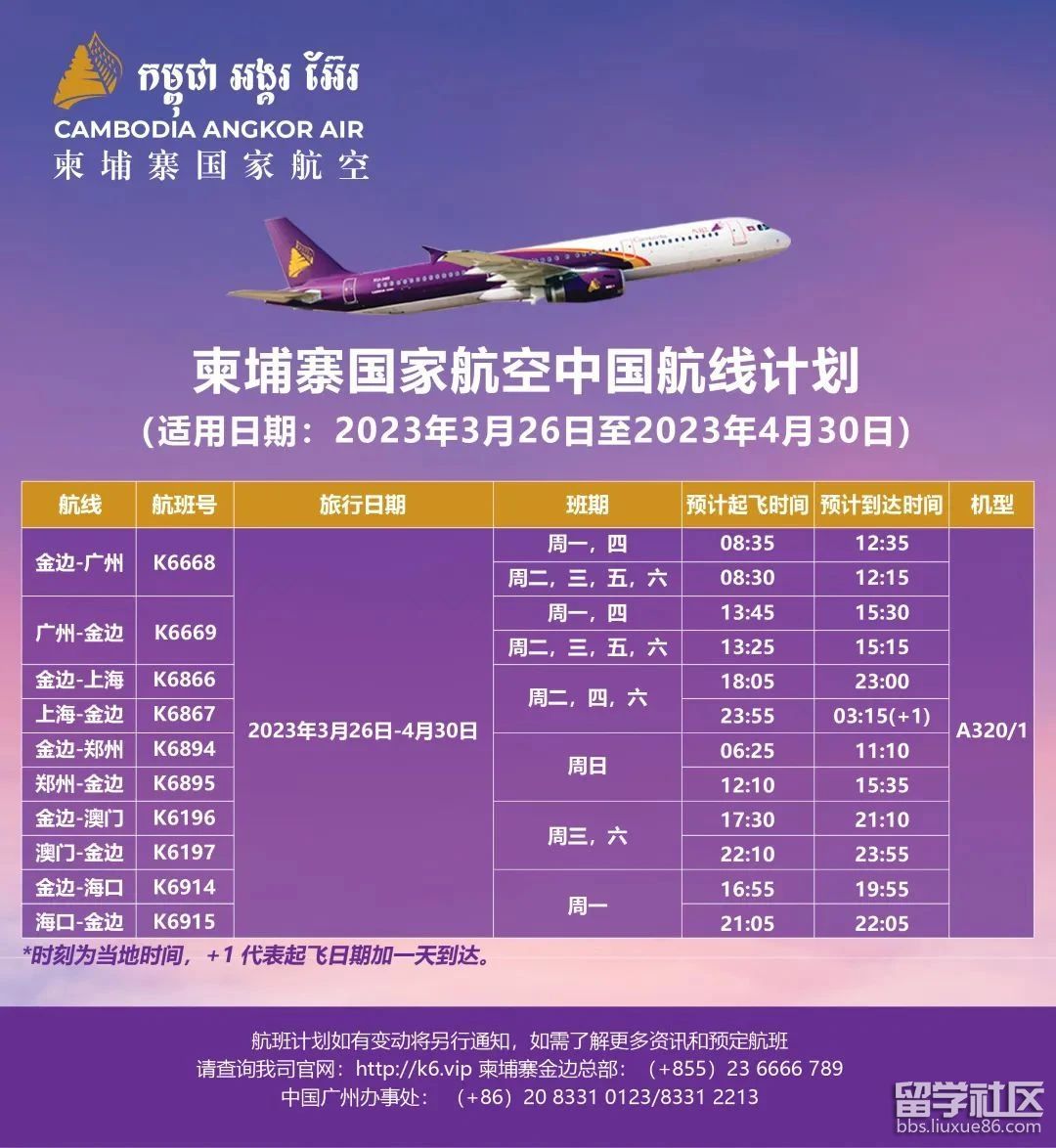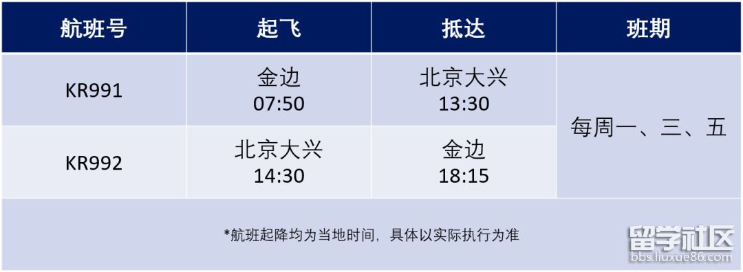 3月27日,柬埔寨航空金邊?北京大興盛大啟航,班期為每周一、三、五,具體航班時(shí)刻表如下: