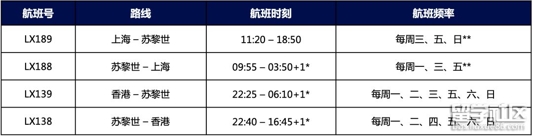 近期,瑞士國(guó)際航空增加夏季時(shí)刻蘇黎世往返中國(guó)航班頻次。其中,蘇黎世往返上海的航班頻率將增為每周三班,蘇黎世往返中國(guó)香港的航班頻率將增為每周六班。新增航班時(shí)刻表如下: