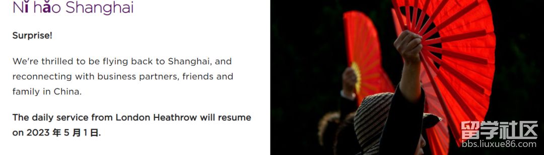 除了英航,維珍航空也于同日官宣了復(fù)航消息,自5月1日起,恢復(fù)倫敦與上海的每日往來航班,機票價格為每人6149元人民幣起(該價格為上海至倫敦經(jīng)濟艙單程票價)。