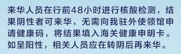 自北京時間2023年1月8日起,自英國赴華人員無需向中國駐英使領(lǐng)館申請健康碼。赴華人員需在行前48小時進行核酸檢測,結(jié)果陰性者可赴華。