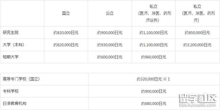 第一年需要繳納的入學(xué)費(fèi)和學(xué)費(fèi)的平均金額如下所示。此外,也有需要支付考試費(fèi)、教材和實習(xí)費(fèi)等的情況。