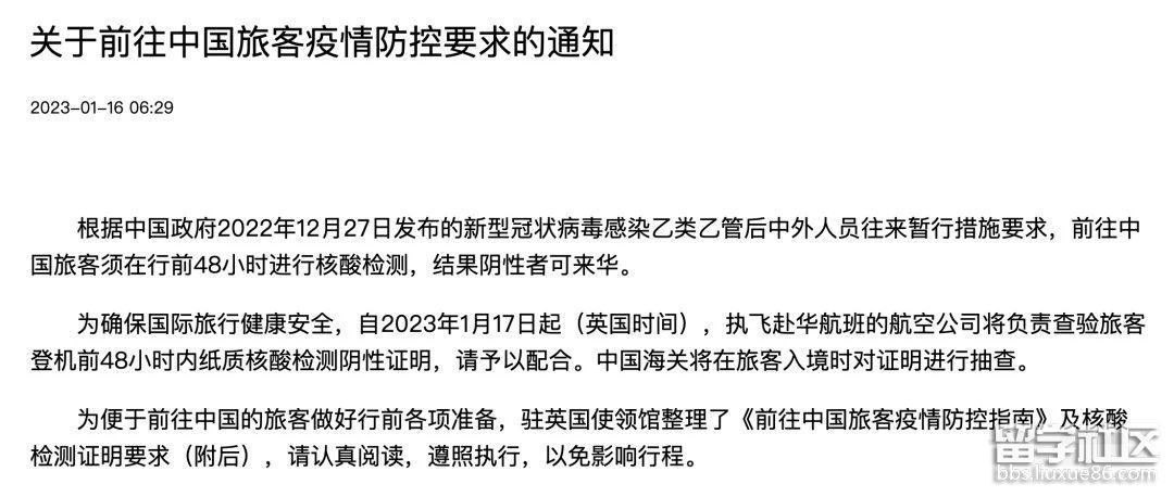 為確保國際旅行健康安全,自2023年1月17日起(英國時間),執(zhí)飛赴華航班的航空公司將負責(zé)查驗旅客登機前48小時內(nèi)紙質(zhì)核酸檢測陰性證明,請予以配合。中國海關(guān)將在旅客入境時對證明進行抽查。