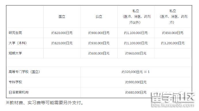 第一年需要繳納的入學費和學費的平均金額如下所示。此外,也有需要支付考試費、教材和實習費等的情況。