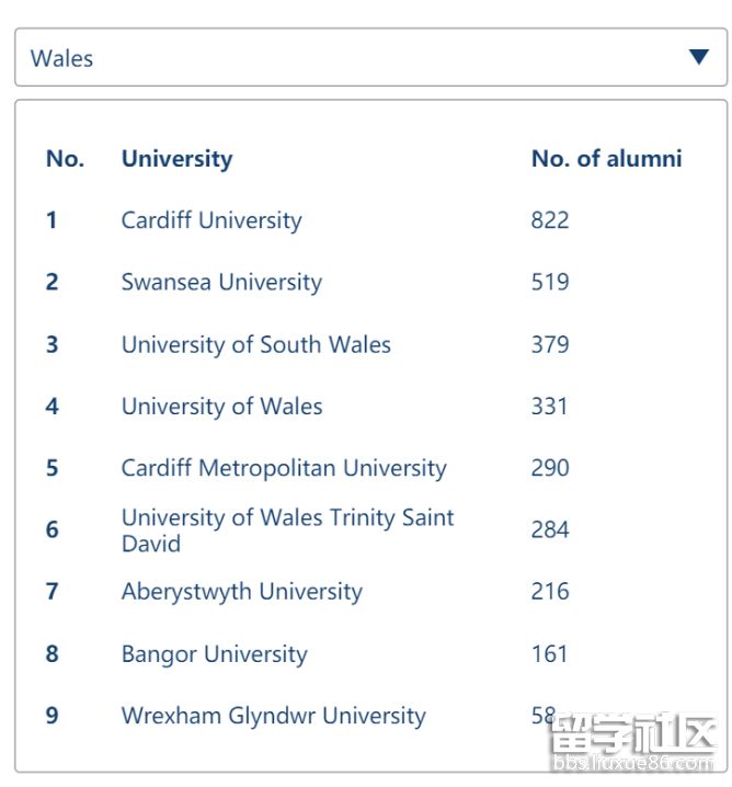 卡迪夫大學(xué)(Cardiff)擁有最多科技大廠的校友(822),斯旺西大學(xué)(Swansea)和南威爾士大學(xué)其次。