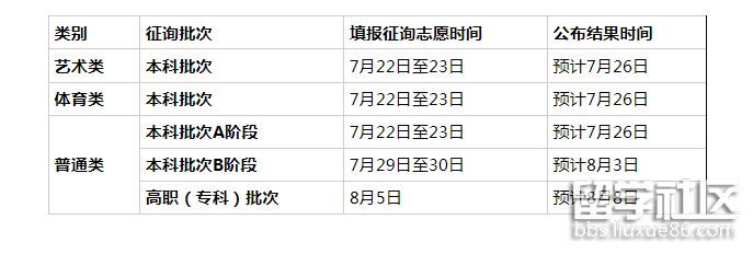注:普通類、藝術類、體育類高職(??疲┡翁顖笾驹笗r間為7月29日至7月31日。