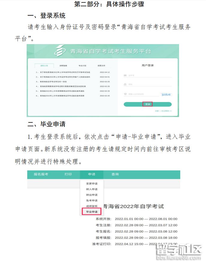 (一)考生申請(qǐng)畢業(yè)條件和所需材料詳見《青海省高等教育自學(xué)考試畢業(yè)審定工作實(shí)施細(xì)則(試行)》,實(shí)施細(xì)則可登錄青海省教育考試網(wǎng)“自學(xué)考試”專題專欄或自考服務(wù)平臺(tái)“政策文件”下查看。