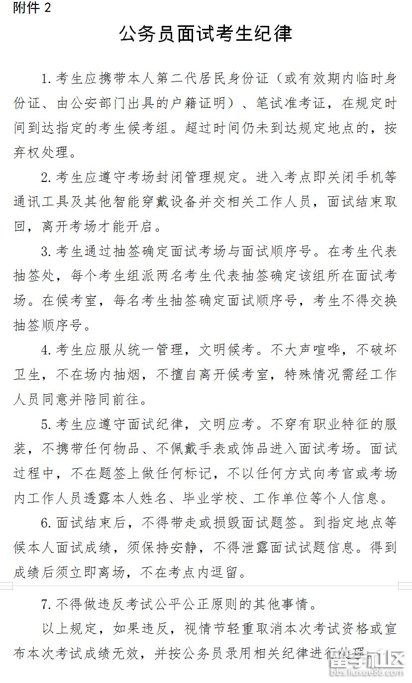 1.考生須在規(guī)定的時間內(nèi),憑筆試準考證、第二代居民身份證(或有效期內(nèi)臨時身份證、由公安部門出具的戶籍證明),進入考點參加面試。