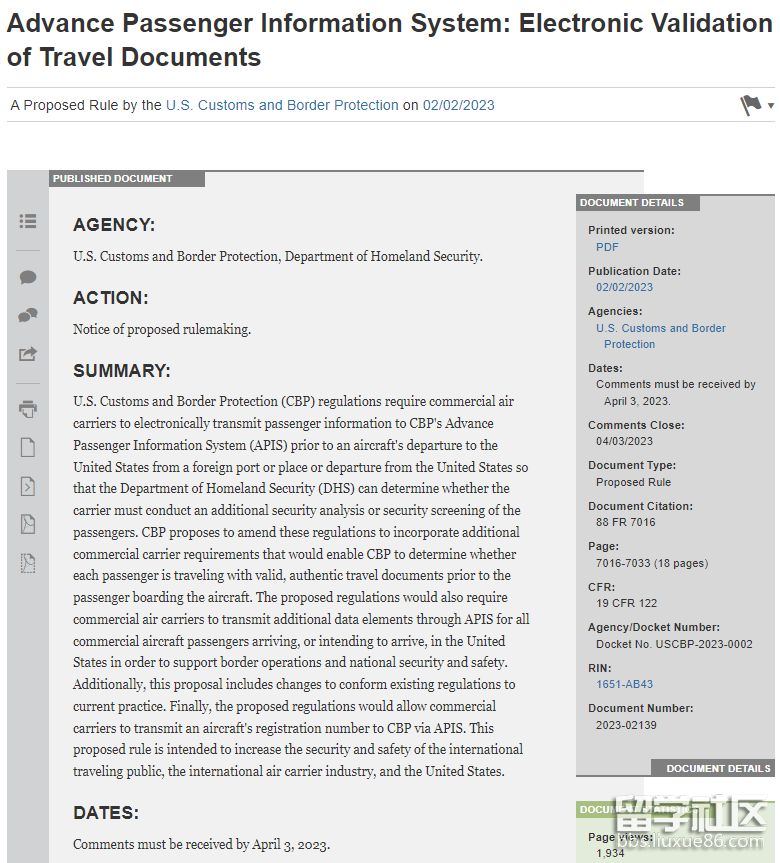 據(jù)Viewfromthewing消息,美國海關與邊境保護局CBP遞交提案要求,所有乘坐美國航班的乘客需提供在美地址、兩個電話號碼和電子郵件地址,任何不遵守或不能提供以上信息的乘客將被拒絕登機。