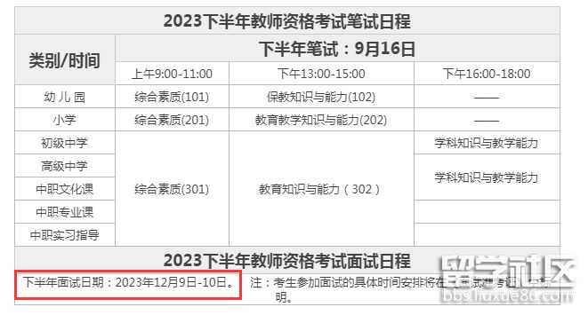 2023下半年教師資格證面試考試時間在12月9日-10日進行,面試具體時間安排如下表: