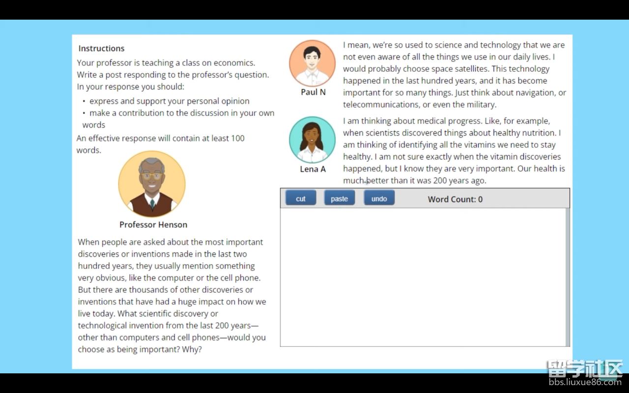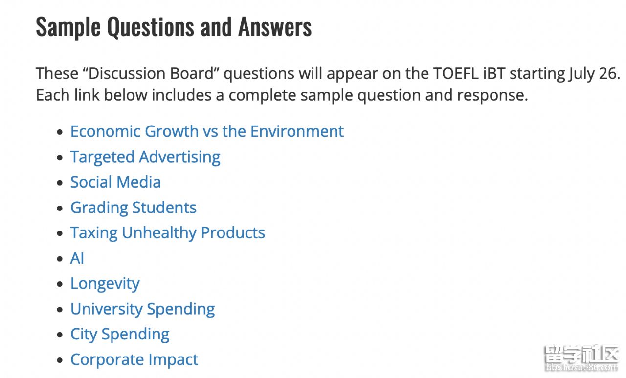 寫作部分保留綜合寫作,取消獨(dú)立寫作,增加 “Discussion board”學(xué)術(shù)討論(本部分來自托福系列考試 TOEFL Essentials)