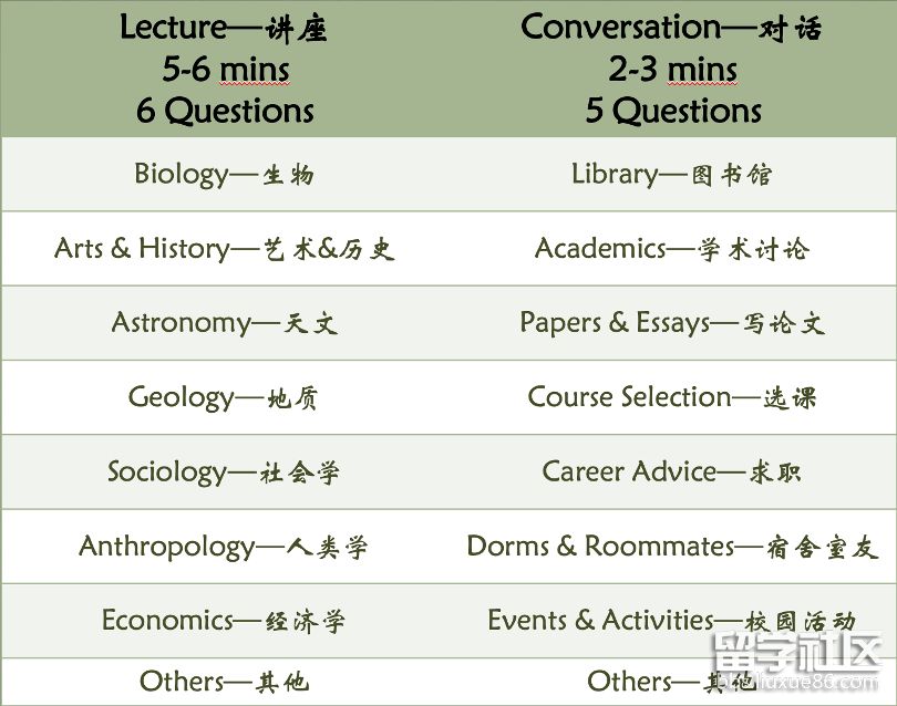 聽力內(nèi)容分為兩類:對(duì)話(Conversation)和講座(Lecture)。每篇對(duì)話時(shí)長約2-3分鐘,講座約5分鐘。音頻僅播放一遍,考生需要在聽完錄音后,借助記憶或筆記回答相應(yīng)問題。