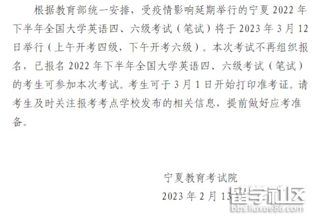 寧夏的考生注意了,寧夏教育考試院發(fā)布了2022年下半年英語四六級考試延期的通知,考試時間定于3月12日,請各位考生做好考試準(zhǔn)備。下面是小編為大家整理的“2022年下半年寧夏英語四六級延期考試時間安排”,可供各位考生參考。