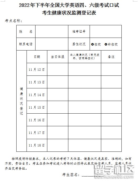 點(diǎn)擊下載附件1:2022年下半年全國大學(xué)英語四、六級考試口試考生健康狀況監(jiān)測登記表