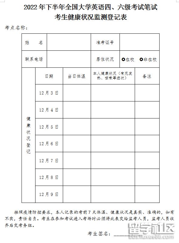 點(diǎn)擊下載附件2:2022年下半年全國大學(xué)英語四、六級考試筆試考生健康狀況監(jiān)測登記表