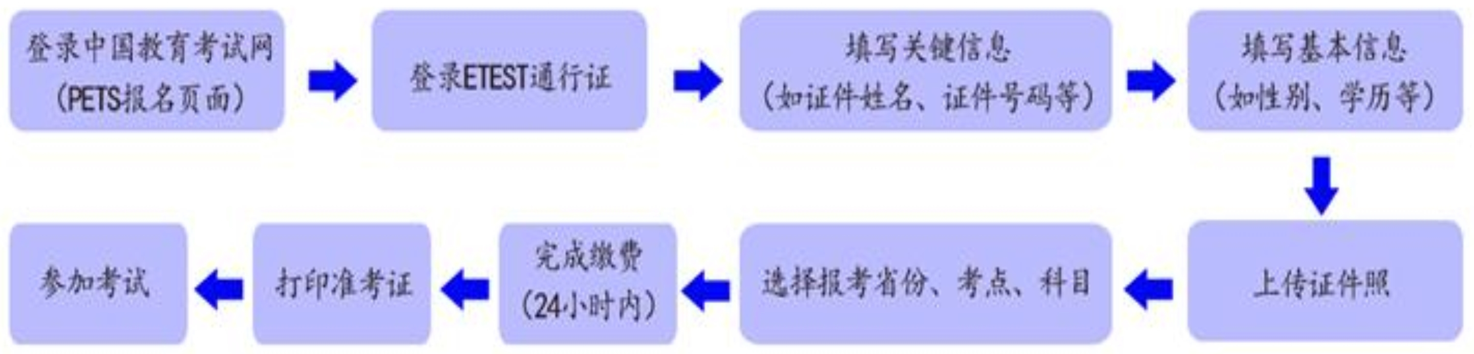 考生需按要求登錄報名網(wǎng)站(http://pets.neea.edu.cn)完成網(wǎng)上注冊、科目選擇及網(wǎng)上繳費。