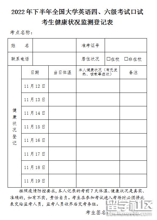2022年下半年全國大學(xué)英語四、六級考試口試考生健康狀況監(jiān)測登記表: