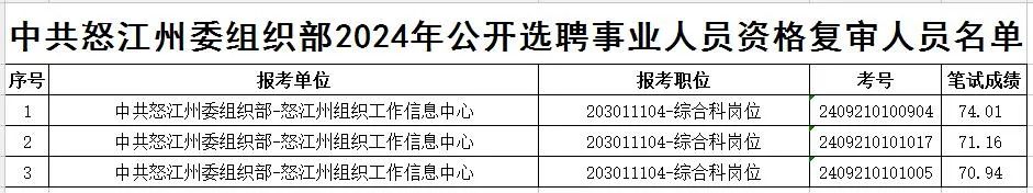 根據(jù)《怒江州2024年州級(jí)事業(yè)單位公開(kāi)選聘工作人員公告》要求,為做好中共怒江州委組織部公開(kāi)選聘事業(yè)人員進(jìn)入面試范圍考生資格復(fù)審工作,現(xiàn)就有關(guān)事項(xiàng)公告如下: