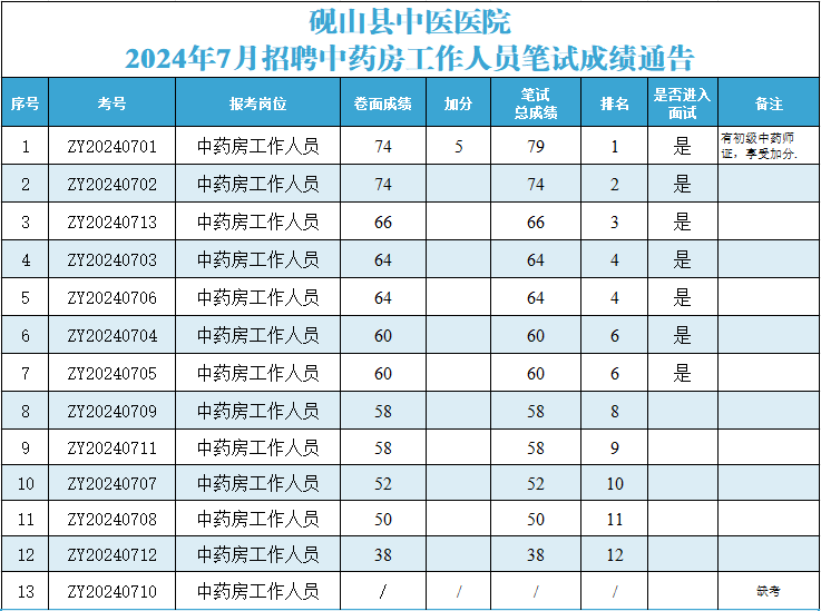 硯山縣中醫(yī)醫(yī)院2024年7月招聘中藥房工作人員筆試成績通告