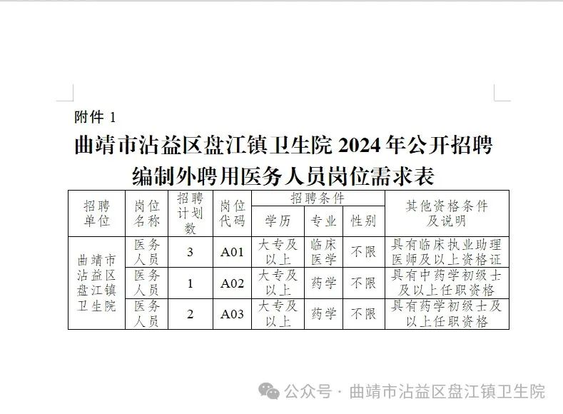 附件:1.曲靖市沾益區(qū)盤江鎮(zhèn)衛(wèi)生院2024年公開招聘編制外聘用醫(yī)務 人員崗位需求表