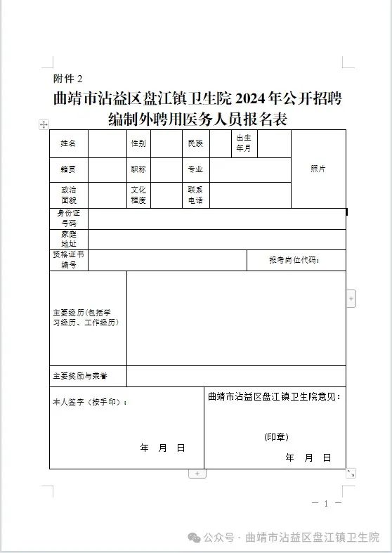 2.曲靖市沾益區(qū)盤江鎮(zhèn)衛(wèi)生院2024年公開招聘編制外聘用醫(yī)務 人員報名表
