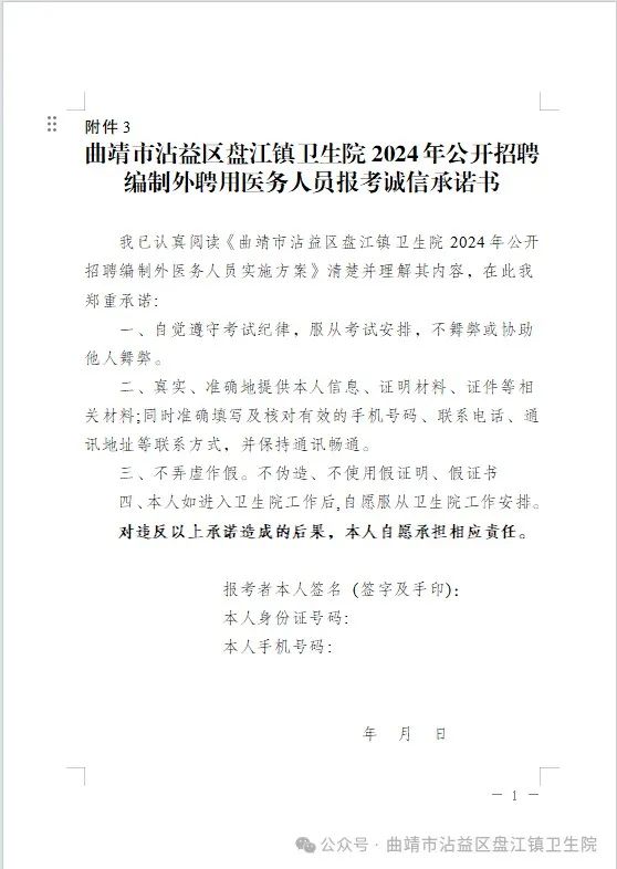 2.《2024年曲靖市沾益區(qū)盤江鎮(zhèn)衛(wèi)生院公開招聘編制外聘用醫(yī)務人員報考誠信承諾書》原件1份(附件3);