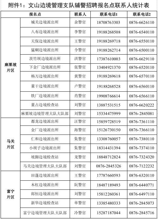 附:1.文山邊境管理支隊(duì)輔警招聘報名點(diǎn)聯(lián)系方式