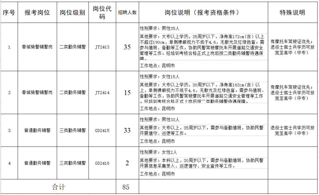 本次共招聘85人,單位為昆明市公安局各直屬部門,崗位信息如下: