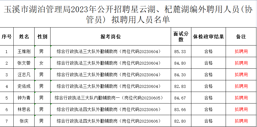 根據(jù)《玉溪市湖泊管理局2023年公開招聘星云湖、杞麓湖編外聘用人員(協(xié)管員)公告》的要求,經(jīng)過報名、資格審查、面試、體檢、政審等程序,現(xiàn)將擬聘用人員名單進(jìn)行公示。