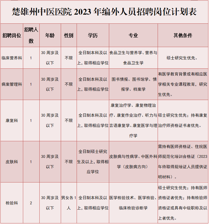 楚雄州中醫(yī)醫(yī)院2023年編外人員招聘公告