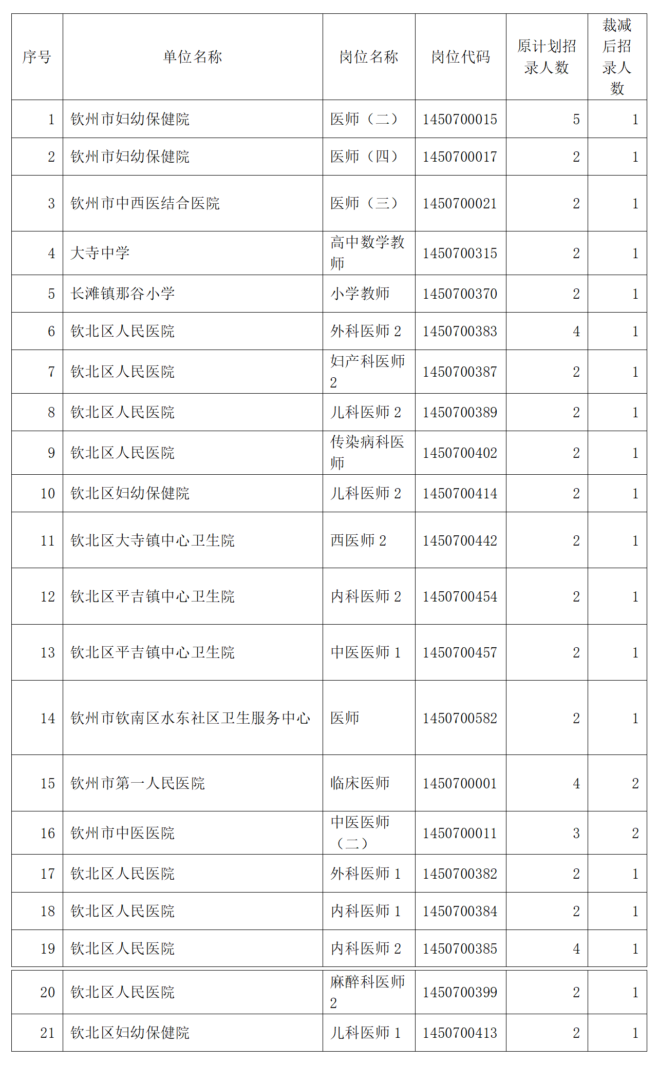 根據(jù)《關(guān)于印發(fā)<廣西壯族自治區(qū)事業(yè)單位公開招聘人員實施辦法>的通知》(桂人社發(fā)〔2011〕155號)和《2023年欽州市市直、欽南區(qū)、欽北區(qū)和中國(廣西)自由貿(mào)易試驗區(qū)欽州港片區(qū)事業(yè)單位考試招聘工作人員公告》精神,截止2023年3月29日,2023年欽州市市直、欽南區(qū)、欽北區(qū)和中國(廣西)自由貿(mào)易試驗區(qū)欽州港片區(qū)事業(yè)單位考試招聘工作人員網(wǎng)上報名、網(wǎng)上資格審查和考生繳費工作已全部完成。結(jié)合崗位招聘名額、考生資格審核和繳費情況實際,經(jīng)市直招聘單位主管部門,欽南區(qū)、欽北區(qū)人力資源和社會保障局及中國(廣西)自由貿(mào)易試驗區(qū)欽州港片區(qū)管委會組織人社局審核并報市人力資源社會保障局核準(zhǔn),現(xiàn)將須核減的崗位招聘名額和不予開考崗位公告如下: