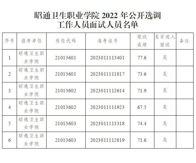 按照筆試成績從高到低的順序,以2:1的比例確定面試人員。按2:1的比例末位出現(xiàn)筆試成績相同的,一并進(jìn)入面試。通過筆試最低控制分?jǐn)?shù)線的人數(shù)與崗位選調(diào)人數(shù)比例未達(dá)到2:1的,按實際筆試合格人員確定面試人員。本次選調(diào)進(jìn)入面試人數(shù)6人,具體人員名單詳見《昭通衛(wèi)生職業(yè)學(xué)院2022年公開選調(diào)工作人員面試人員名單》(附件1)。