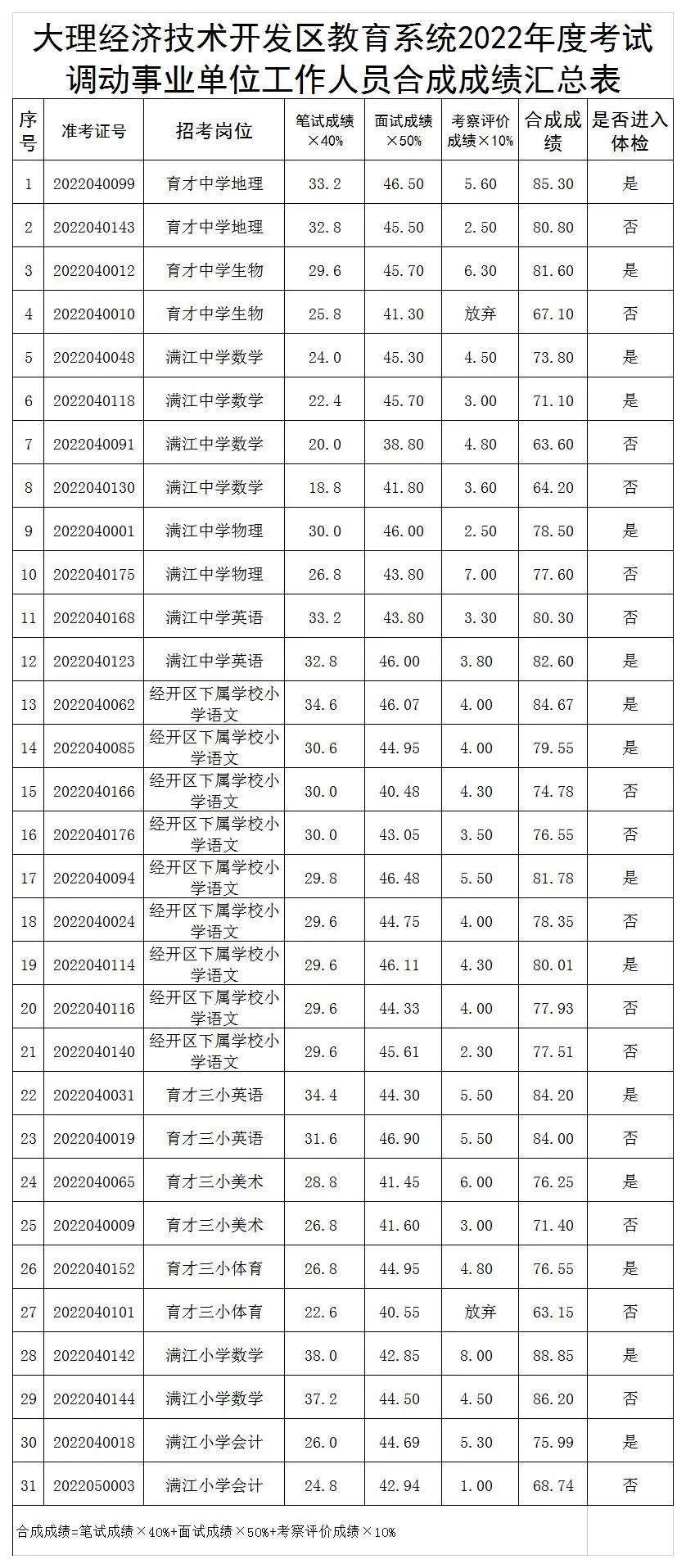 大理經(jīng)濟(jì)技術(shù)開發(fā)區(qū)教育系統(tǒng)2022年度考試調(diào)動事業(yè)單位工作人員綜合成績公告