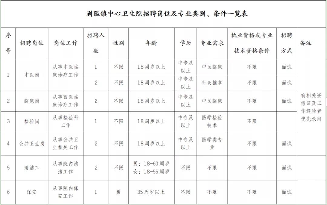 剝隘鎮(zhèn)中心衛(wèi)生院因業(yè)務(wù)發(fā)展需要,現(xiàn)面向社會公開招聘編外職工11人,招聘有關(guān)事項公示如下: